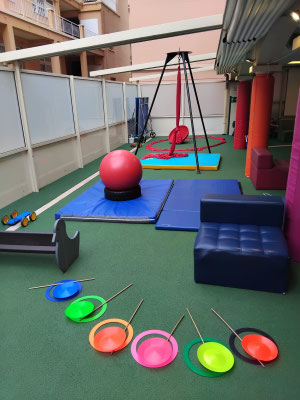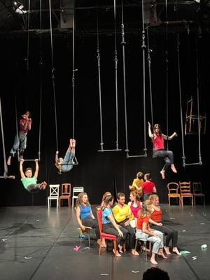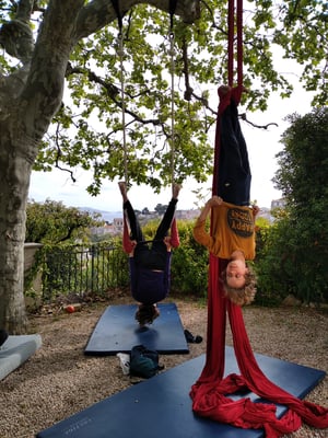 - Découverte ou perfectionnement des techniques aériennes: (environ 5h de pratique quotidienne) tissu, corde lisse et trapèze