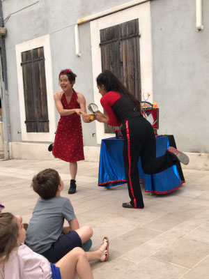 Contes, trapèze, manipulation d'objets : chapeau, petit cirque de puces, guitare, accordéon, chant...