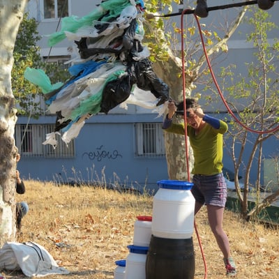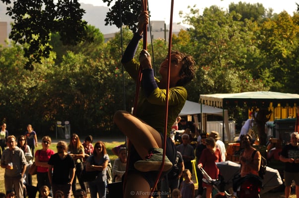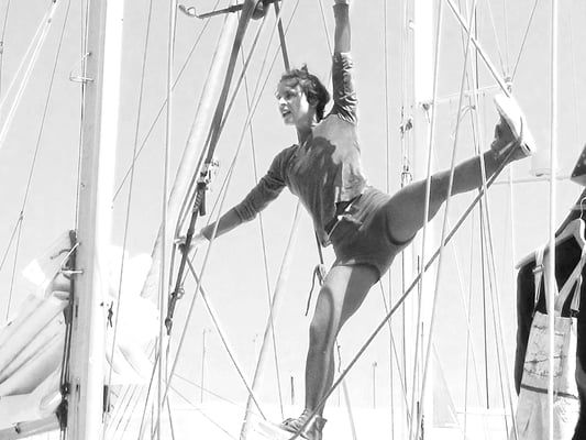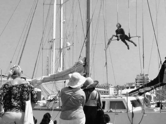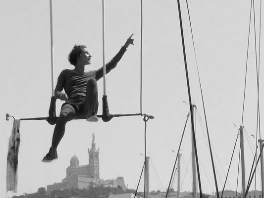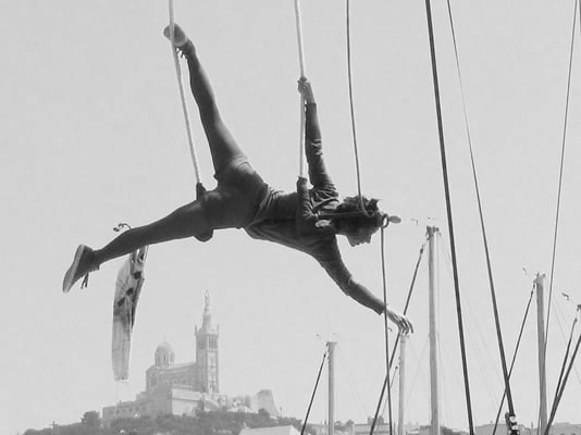 Performance aérienne jouée sur voilier (goélette Bazar en méditerranée), portique-triangle ou arbre in situ (à repérer en